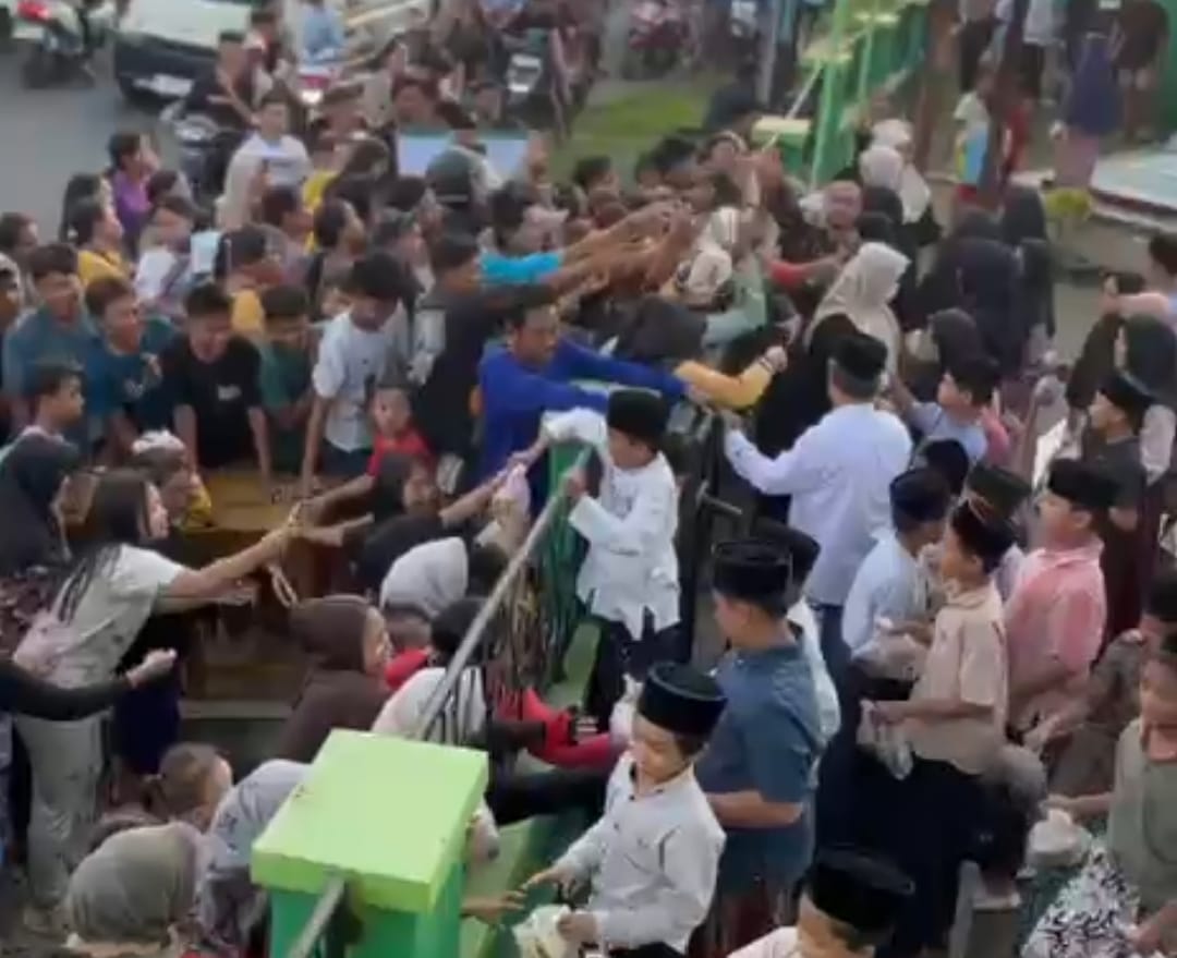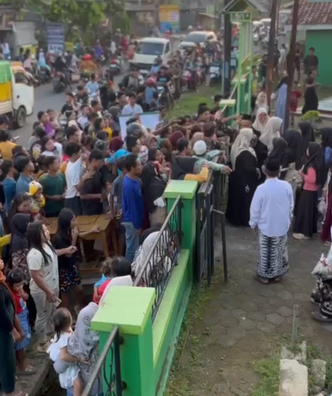 Meski kondisi lalu lintas di depan madrasah sempat padat merayap karena banyaknya warga yang mengantre, kehadiran para guru dan panitia memastikan pembagian berjalan lancar dan tertib.